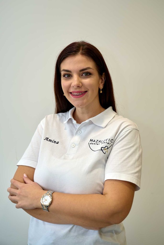 Prvo iskustvo kao stomatološka sestra ostvarila je 2020.u ordinaciji “Dental Art “ gdje je asistirala na svim poljima stomatologije, a naročito tokom oralno hirurških intervencija. U našoj ordinaciji počela je raditi krajem 2020.godine. Njena odgovornost i predanost poslu su ono što je dodatno motiviše. Pored redovnih i kontinuiranih edukacija asistentica Amina završava dodatne vrste edukacija. Kako bi unaprijedila svoje znanje 2024.godine završava napredni iTOP tečaj namijenjen edukaciji o dentalnoj higijeni, održavanju iste te profilaktičkim mjerama, napravljen od strane stručnjaka i kompanije Curaprox